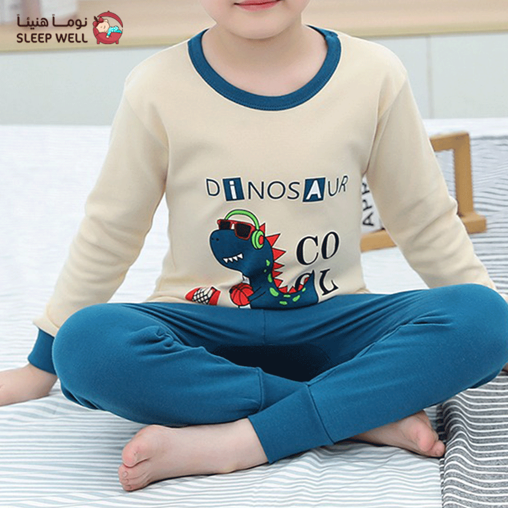 - اللون: يتكوّن الطقم من قميص فاتح بطبعة ديناصور وسروال أزرق داكن.